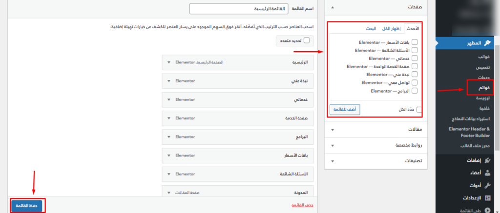 نذهب إلى “المظهر > قوائم” ونقوم بإضافة عناصر جديدة أو تعديل العناصر الموجودة ثم نضغط على زر “حفظ القائمة”
